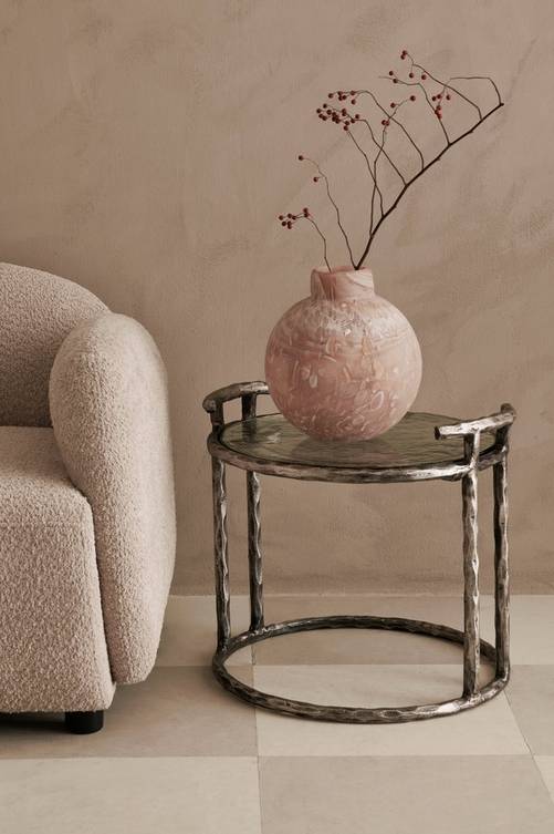 Sidobord / sängbord med rustik look. Stomme av aluminium med grov, oregelbunden struktur i antikfinish. Skiva av tjockt, tempererat glas med oregelbunden struktur. Glasets tjocklek 20 mm.