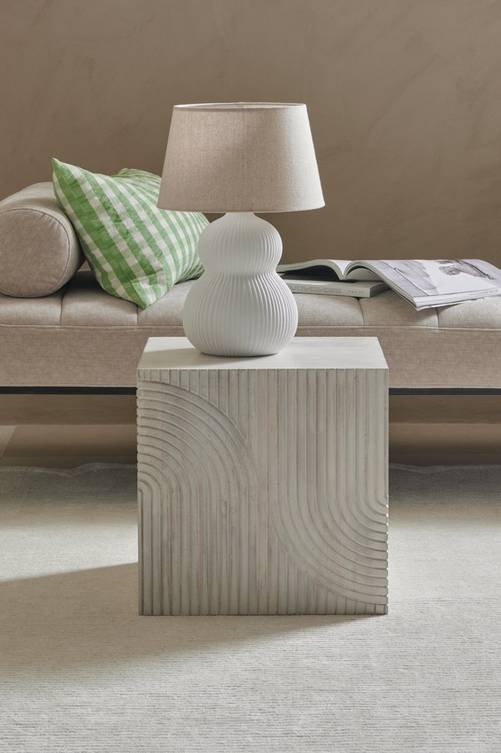 Kubformat sidobord av mangoträ med ett dekorativt, snidat strukturmönster på alla sidor. Slät topp.