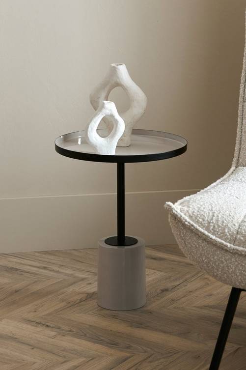 Runt sidobord i metall med lackad, högblank yta. Levereras monterad.