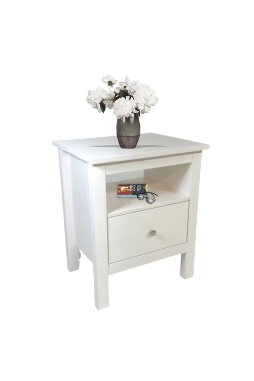 Sidobordet Vesa Home har en klassisk skandinavisk design. Det kan användas som nattduksbord i sovrummet eller som sidobord i vardagsrummet. Smart design med hylla och låda där du kan förvara mindre saker. Om du vill kombinera sidobordet med en annan möbel, så passar tv-bänk, skrivbord, soffbord, konsolbord eller matbord i klassisk skandinavisk design. Du som älskar skandinavisk design kommer verkligen att uppskatta den här modellen från serien Vesa. Fördelen med furu är att du tar in en liten bit av naturen i ditt hem. Unika produkter: Vesa Home erbjuder produkter för olika rum (t.ex. vardagsrum, matsal, barnrum, hall). Dessutom gör du något bra för miljön genom att välja miljövänliga möbler. Hög kvalitet, 100 % trä, 100 % tillverkat i Europa. Lätt att sätta upp – endast enkel montering med medföljande verktyg krävs. Lådans innermått: 289 mm x 342 mm x 129 mm, hyllans innermått: 322 mm x 342 mm x 129 mm
