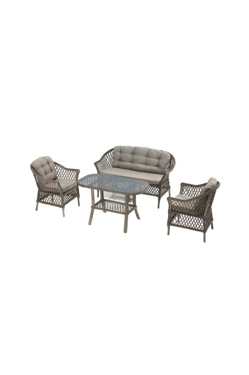 Stomme: 100 % aluminium soffans mått (2-sitsig): bredd: 138 cm djup: 70 cm höjd: 85 cm fåtöljernas mått: bredd: 70 cm djup: 70 cm höjd: 90 cm bordets mått: bredd: 110 cm djup: 60 cm höjd: 67 cm