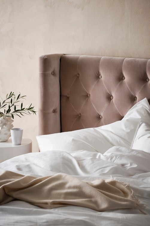 Fristående gavel klädd med sammet och djuphäftade klädda knappar. Du skapar en lyxig hotellkänsla hemma med en djuphäftad sänggavel med vingar. Allt i finaste sammet av bomullsmix. Material: 89% bomull, 11% polyester, trästomme och skumgummifyllning. Storlek: Gavelbredd 130 cm. Sängbredd 120 cm. Höjd 122 cm. Djup 10 cm. Skötselråd: Dammsugning. Tips/råd: Förutom bekvämt stöd för ryggen får du ett mjukare intryck med en stoppad sänggavel. Gaveln behöver ingen montering, ställ den bara mellan säng och vägg.