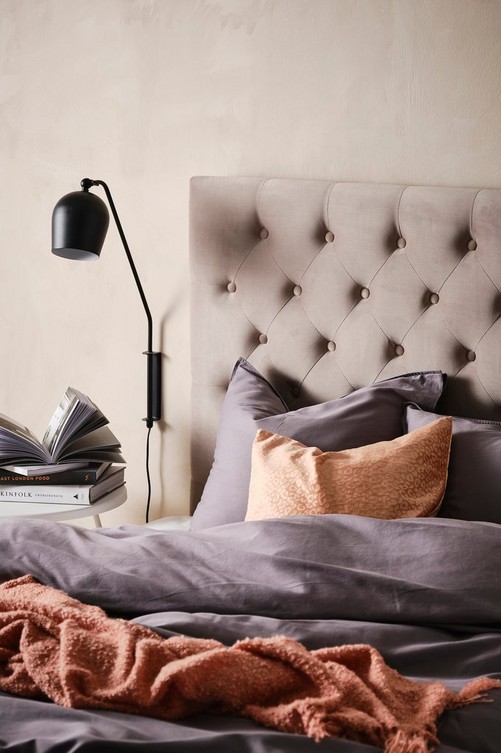 Fristående gavel klädd med sammet och djuphäftade klädda knappar. Skapa en personlig stil och lyxig känsla i sovrummet med en gedigen sänggavel i mjuk sammet. Väggfästen medföljer. Material: 100% polyester, trästomme och skumfyllning. Storlek: Bredd 120 cm. Höjd 122 cm. Djup 10 cm. Skötselråd: Torkas med fuktig trasa. Tips/råd: Gaveln behöver ingen montering, ställ den bara mellan säng och vägg. Bädda som på hotell med lyxiga sängkläder i varma färger.
