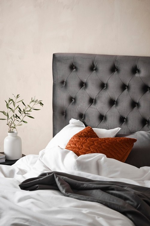 Fristående gavel klädd med sammet och djuphäftade klädda knappar. Skapa en personlig stil och lyxig känsla i sovrummet med en gedigen sänggavel i mjuk sammet. Väggfästen medföljer. Material: 100% polyester, trästomme och skumfyllning. Storlek: Bredd 120 cm. Höjd 122 cm. Djup 10 cm. Skötselråd: Torkas med fuktig trasa. Tips/råd: Gaveln behöver ingen montering, ställ den bara mellan säng och vägg. Bädda som på hotell med lyxiga sängkläder i varma färger.