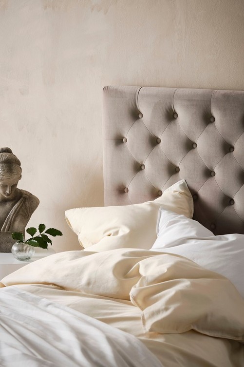 Fristående gavel klädd med sammet och djuphäftade klädda knappar. Skapa en personlig stil och lyxig känsla i sovrummet med en gedigen sänggavel i mjuk sammet. Väggfästen medföljer. Material: 100% polyester, trästomme och skumfyllning. Storlek: Bredd 90 cm. Höjd 122 cm. Djup 10 cm. Skötselråd: Torkas med fuktig trasa. Tips/råd: Gaveln behöver ingen montering, ställ den bara mellan säng och vägg. Bädda som på hotell med lyxiga sängkläder i varma färger.
