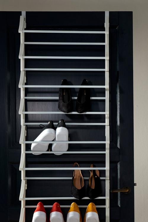 för ca 20 par skor. Metallrör med sidor av plast. Kan hängas på dörr eller fästas på väggen. Bredd 52 cm. Höjd 160 cm. Djup 19 cm. Lev. omonterad.