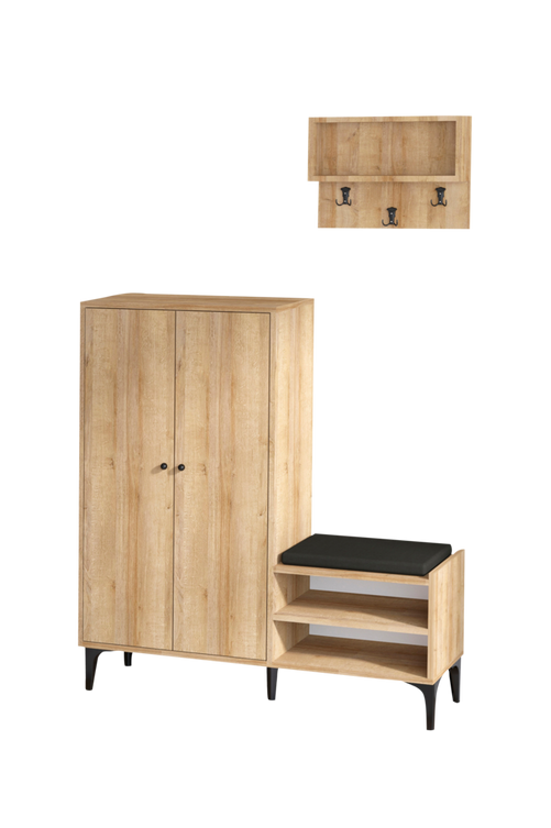 100% SPÅNSKIVA MED MELAMINBELÄGGNING Tjocklek: 1,8 cm Skoskåp, mått: Bredd: 120 cm Höjd: 137 cm Djup: 35 cm Klädhängare, mått: Bredd: 50 cm Höjd: 35 cm Djup: 12 cm Ben av plast Klädhängare Flera hyllplan Kan fästas i väggen