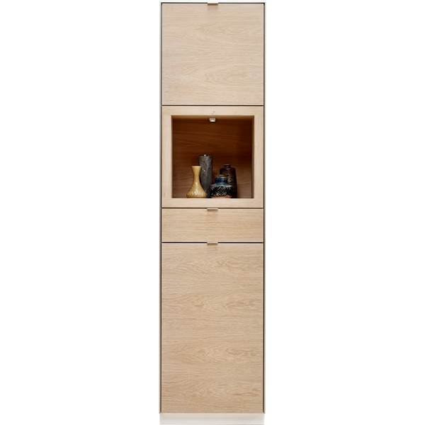 Vitrinskåp, 3 hyllor, 2 högerhängda dörrar, 1 låda och med sockel, levereras monterad. – Vitoljad ekfaner, front i vitoljad ekfaner och kantlister och handtag i aluminium