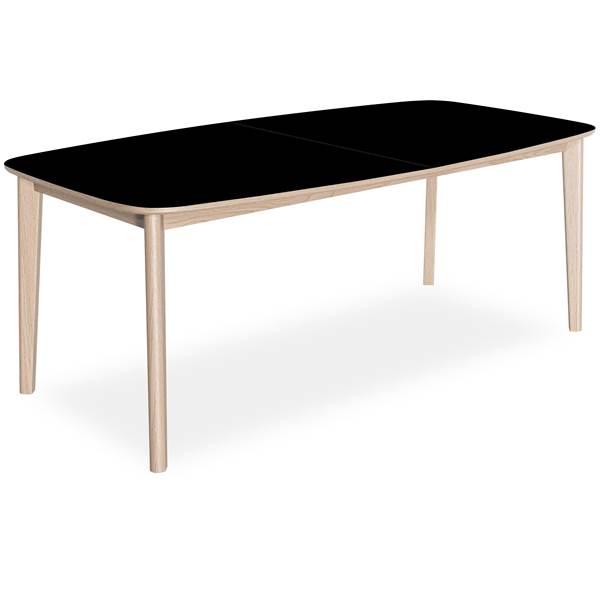 Matbord, utdragbar för 2 tilläggsplatser, Med plats för 2 iläggsskivor, . . – Topp i svart nanolaminat, kant i vitoljad ek och stomme i vitoljad ek