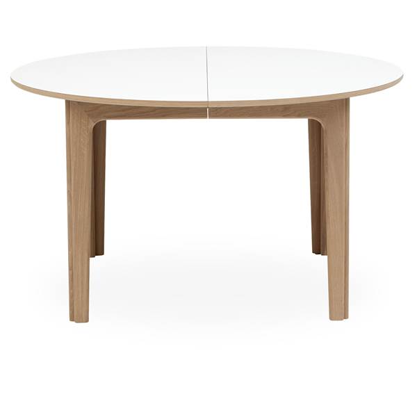 Matbord, med 2 iläggsskivor. inklusive 1 stödben, Utdraget mått 230 cm, . , OBS! tung vara, läs mer i våra leveransvillkor. – Topp i vit laminat, kant i vitoljad ek och ben i vitoljad ek