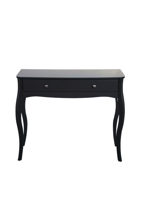 Skrivbord med formade ben och en funktionell låda för förvaring producerad i en kombination av MDF och massiv tall med en fin lackerad yta. Enkel självmontering.