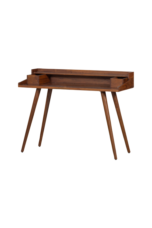 Imponerande skrivbord med retrokänsla Tillverkat av behandlat akaciaträ Praktiskt: två extra, separata fack för tillbehör H 90 x B 117 x D 50 cm Brik skrivbord ingår i en kollektion från det nederländska inredningsmärket Basiclabel och är en perfekt plats för att göra läxor eller låta kreativiteten flöda! Brik har stor bordsyta, en praktisk extra hylla och två separata brickor som du kan flytta runt smidigt, som är praktiska för pennor, post-it-lappar eller tuschpennor. Bli produktiv med Brik! VARNING för tipprisk! För möbler högre än 70 cm rekommenderar vi att vara extra uppmärksam på väggfästet. Tippskydd förhindrar olyckor och ser till att möblerna inte välter. Material Akaciaträ kännetecknas av den varma, röda nyansen. Denna färg avtar något vid användning och exponering för ljus. De tydliga ådringarna och flammiga märkena ger detta tåliga träslag mycket karaktär. Olika färgnyanser, oregelbundenheter och sprickor ger djup och karaktär till denna naturprodukt. Mått Höjd: 90 cm Bredd: 117 cm Djup: 50 cm Stommens tjocklek: 1,5 cm Hyllans bredd: 114 cm Hyllans djup: 12 cm Avstånd mellan hyllan och ovansidan: 10 cm Ovansidans bredd: 114 cm Arbetsytans djup: 49 cm 2 lådor, yttre mått HxBxD: 10x30x15 cm 2 lådor, inre mått HxBxD: 8,5x27x12 cm Benens höjd: 73,5 cm Ben diameter: Ø 6/3 cm Avstånd mellan de främre benen: 70/107 cm Avstånd mellan benen i sidan: 26/41 cm Maximal belastning: 35 kg Vikt: 25 kg Skötsel Du håller enkelt föremål av akaciaträ rena med en ren, torr trasa. För mer noggrann rengöring kan akaciaträet torkas av med en lätt fuktad trasa och ljummet vatten. Ytterligare behandling med en speciell möbelolja är möjlig, och detta förstärker den vattenavvisande effekten från de naturliga oljorna som finns i denna typ av trä. Leverans Produkten levereras i ett paket och är lätt att montera med hjälp av den bifogade monteringsanvisningen. Vi rekommenderar att noga fästa tippskyddet på väggen för att förhindra olyckor. För att skydda hårda golv, sätt möbeltassar av filt på undersidan av benen (Ø2 cm).