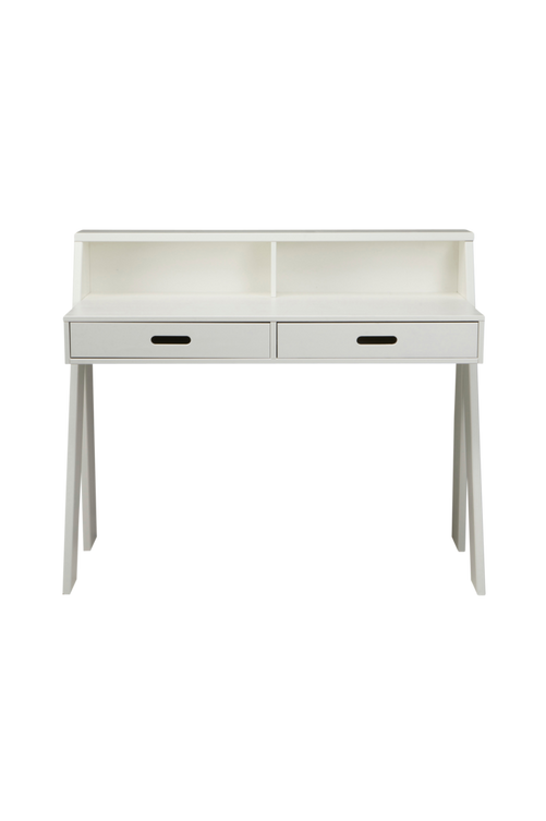 Skrivbord med ett modernt utseende Material: Tall i färg Praktiskt skrivbord med två lådor för förvaring ((hxwxd) 6,5×47,5×40 cm) Mått: H 93 cm x B 112 cm x D 55 cm Skrivbordets botten till marken är 62 cm, tänk på detta när du köper en kontorsstol. Bänkskivan är 75 cm hög. Facken på bänkskivan har en storlek på (hxwxd) 15,5×52,5×13,5. Vikt: 33,5 kg. Levereras omonterad med tydliga monteringsanvisningar.
