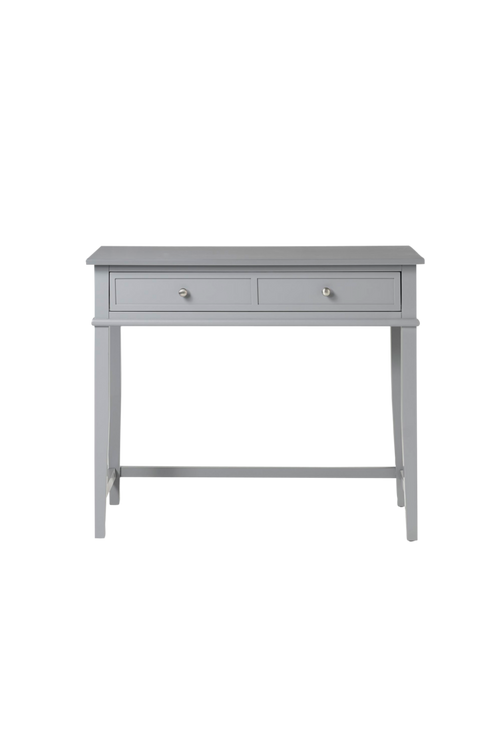 Med skrivbordet Franklin Writing Desk får du den arbetsyta och förvaring som du behöver för att göra ditt arbete. Det stabila skrivbordet är tillverkat av MDF och har ben i solitt trä. De dekorativa kantlisterna och de avsmalnande benen skapar en elegant look som uppgraderar ditt vardagsrum eller hemmakontor i ett nafs. Arbetsytan rymmer laptop, skrivbok och familjefotografier. Den stora lådan har silverfärgade knoppar och är inramad så att det ser ut som två lådor. Den rymmer både papper och kontorsmaterial. Du skapar en enhetlig look genom att inreda rummet med övriga möbler i Franklin-kollektionen (säljs separat). Skrivbordet levereras i ett platt paket och kräver montering. Vi rekommenderar att två vuxna monterar produkten.