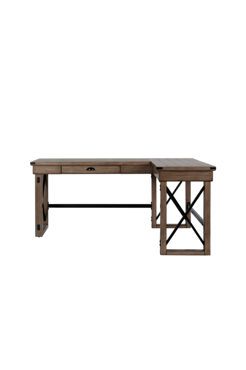 Skapa en rustik känsla på ditt hemmakontor med det L-formade skrivbordet med höjbar bordsskiva Wildwood från Ameriwood Home. Skrivbordet är tillverkat av MDF och träfaner med robusta metalldetaljer och blir säkerligen ett fantastiskt tillskott till din arbetsyta. Den rustika finishen med undertoner ger dig en hemtrevlig känsla medan du arbetar. Skrivbordets L-form håller din dator och alla papper inom räckhåll samtidigt som du får flera alternativ för att organisera din arbetsyta. Du kan ställa skrivbordet mitt i rummet, eller om du har ont om plats, ställ helt enkelt skrivbordet i hörnet för att öppna upp rummet. Lådan är utmärkt för att förvara kontorsmaterial som pennor, tejp och papper. Skrivbordet har även en höjbar bordsskiva så att du enkelt kan växla mellan att sitta och stå när du arbetar. Det L-formade skrivbordet Wildwood från Ameriwood Home levereras i två platta paket och kräver montering. Bordsskivan tål en maximal belastning på 27 kg. Vi rekommenderar att två vuxna monterar produkten. Efter montering mäter det L-formade skrivbordet H76 x B170 x D140 cm.