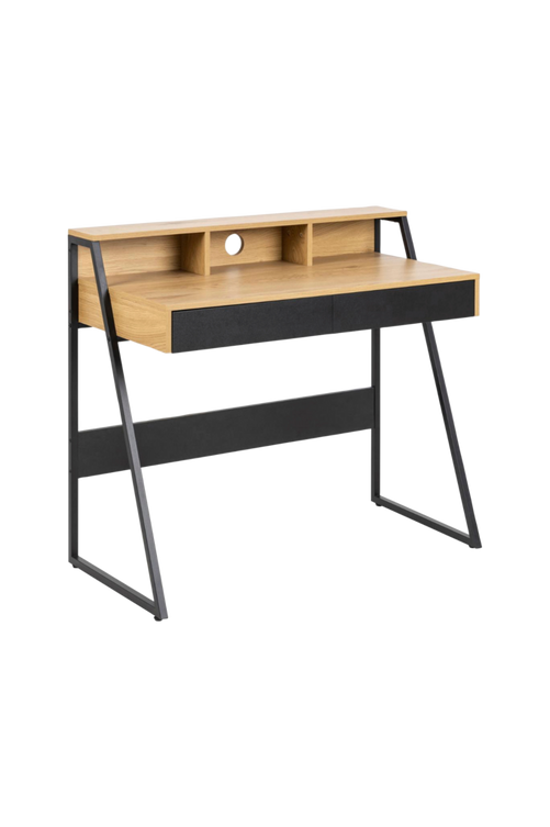 Behåll koncentrationen och öka din produktivitet med detta skrivbord av melamin med vild ek. Tre öppna utrymmen och två lådor gör det enkelt att hålla ordning och reda, så att du inte blir distraherad. Bordsskivan av melamin är lättskött och kräver minimalt med underhåll. Skivor av folierad MDF.