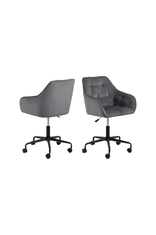 Den perfekta skrivbordsstolen för dig som söker både komfort och stil. Det som gör skillnad är det mjuka sammetstyget och de tuftade detaljerna, som ger stolen en lyxig känsla. Sammetstygets färg skiftar beroende på ljuset och riktningen på luggen, vilket ger en levande, lyxig känsla. För att göra dina dagar enklare snurrar du lätt, tack vare det 5-armade fotkrysset av metall, och justerar höjden med gasliften.
