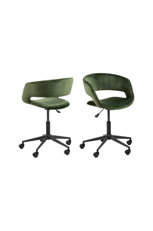 Höjd och sänkbar kontorsstol klädd med sammetstyg. Stolen är på hjul. Mått: Höjd 87 cm, bredd 56 cm och djup 54 cm. Sitthöjd min. 42 cm, max 54 cm. Levereras omonterad.