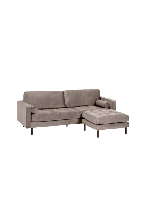 Debra 3-sitssoffa med puff är trendskapande tack vare dess design, textur och färg. Klädd med rosa sammetstyg, stoppad med djuphäftade knappar och synliga sömmar, är den designad för ett trendigt hem. Dessutom är tyget avtagbart, så du kan se till att den alltid är i perfekt skick, snabbt och lätt. Känn dig bekväm och njut av denna designersoffa. Bredd: 222 cm. Djup: 178 cm. Höjd: 103 cm.