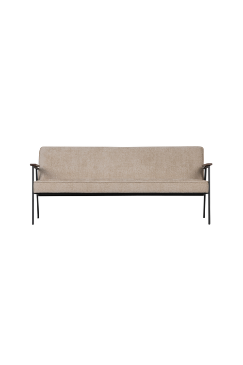 Med sina metallben, trästöd och starkt tyg gör denna soffa ett retro nick i alla inredningar. Mått: sitsens höjd är 45 cm, sittbredden 178 cm och sittdjupet 51 cm. Armstödet har en höjd av 62 cm, en bredd på 6 cm och en längd på 46 cm. Metallbenen är 33 cm höga. Rengöringsinstruktioner; använd inte kemiska medel, ta bort fläckar med en bomullsduk och vatten i runda rörelser, testa vid behov alltid rengöringsprodukter på en osynlig del av soffan.