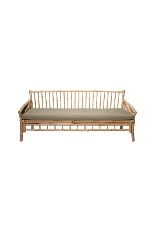 Soffa av bambu (naturfärgad). Dyna (brun/beigerandig) ingår. Monterad. Dynan är gjord i vattenavvisande polyestertyg. Dynans höjd: 6 cm.