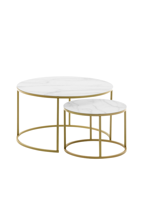 Två runda soffbord Leonor med diameter på 80 cm respektive 50 cm i unik stil. Stomme i guldfärgat stål med ovansida som ser olika ut för varje produkt. Ovansidan är gjord av glas med en skiva med marmoreffekt under. Bredd 80 cm, djup 80 cm och höjd 46 cm..