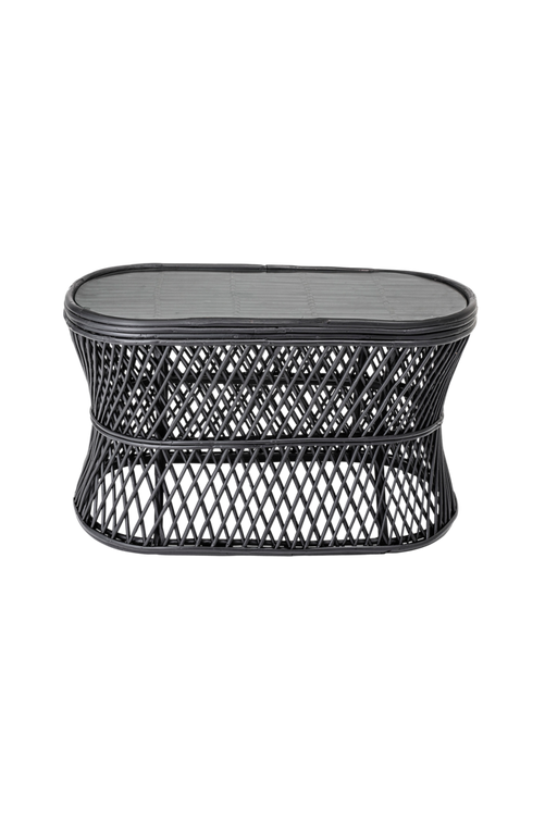 Soffbord, svartmålat sockerrör, glasskiva. Monterat.