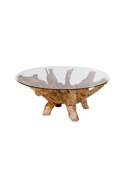 Runt soffbord med glasplatta. Mått: Längd: 110 cm. Bredd: 110 cm. Höjd: 50 cm. Material: Teak och glas. Monterad.