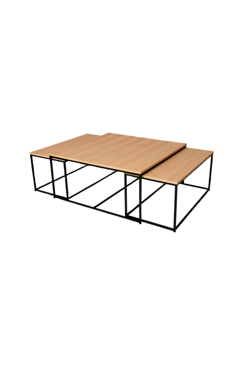 Soffbord i set om 3 st. Lackerad, pigmenterad ekfaner med underreden i lackerad metall. Mått; Stora bordet 100×100, höjd 47 cm. De små borden 47×97, höjd 40 cm. Monterade.