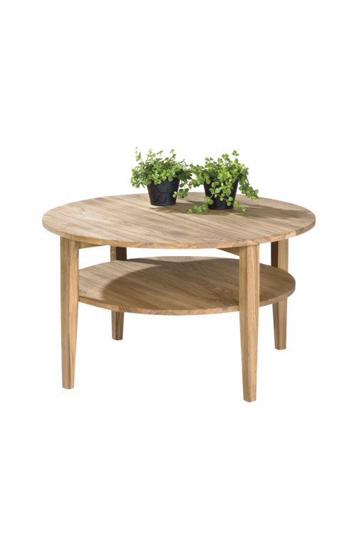 Gediget soffbord i klassik massiv oljad ek. Runt utförande med en smidig hylla under skivan.