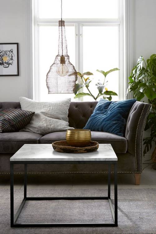 Marmorbord med skiva av marmor och stomme av metall. Stl 75×75 cm. Höjd 48 cm. Då marmor är ett naturmaterial är det normalt att små avvikelser i storlek, färg och struktur förekommer. Underhåll av marmor: För att ge stenen sitt grundskydd rekommenderas marmorpolish som du hittar i välsorterade färgbutiker. Stryk på ett tunt lager. Låt torka i några minuter. Polera upp till glans med en torr trasa. Detta bör upprepas 1 gång per år. Då marmor är en porös stensort måste man vara extra försiktig med ämnen som kan färga av sig, till exempel syror, stekfett, kaffe, bärsaft med mera.