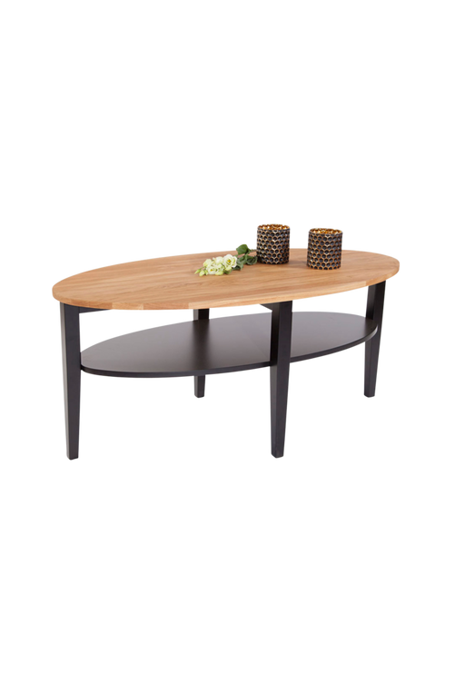 Baltimore är ett stilrent ovalt soffbord i svartlackerat underrede med en massiv oljad toppskiva.