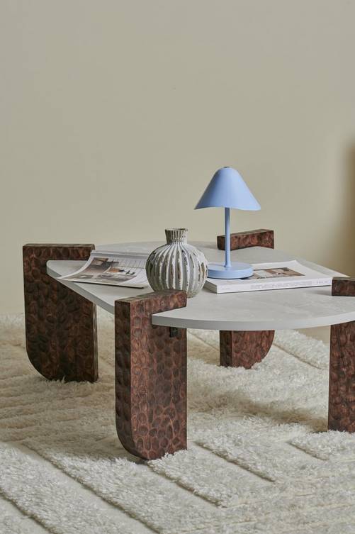 Ovalt soffbord med utanpåliggande ben av mangoträ med karvat mönster och vaxad finish. Toppskiva i laminerad MDF med marmordekor.