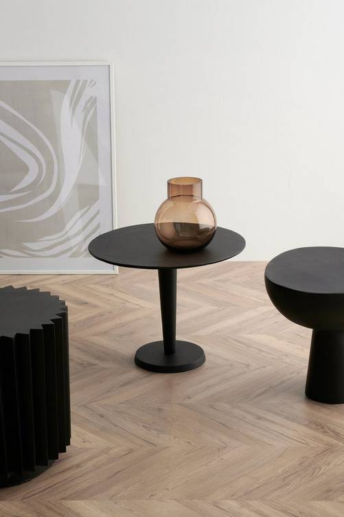 Formgjutet soffbord av aluminium. Pulverlackat, med lätt struktur. Ø 60 cm, höjd 48 cm.