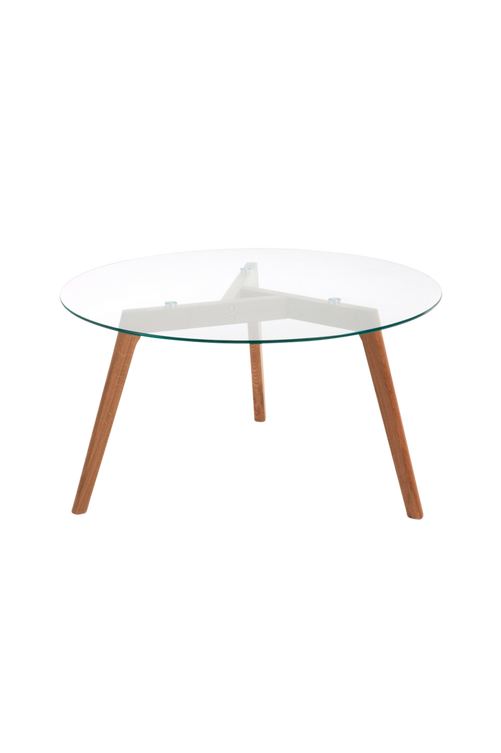 Soffbord med tempererat glas och ekben. Diameter 90 cm. Höjd 45 cm. Montera själv.