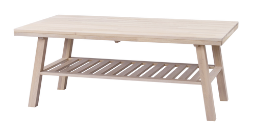 Tidlöst soffbord i stilren design med en förvaringshylla. Soffbordet är i massiv, fingerskarvad ek. Lätt utställda ben. Längd 130 cm, bredd 75 cm, höjd 52 cm. Montera själv.