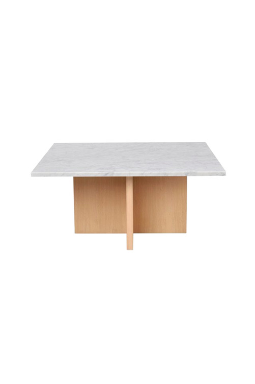 Lyxiga soffbordet Brooksville i Japandi-stil där den skandinaviska designen möter japansk minimalism. Den kvadratiska bordsskivan av exklusiv, vit italiensk Carrara-marmor eller brun Emperador-marmor tillsammans med kryssunderredet av FSC-certifierat trä skapar ett hållbart soffbord och ger en rofylld känsla i rummet.