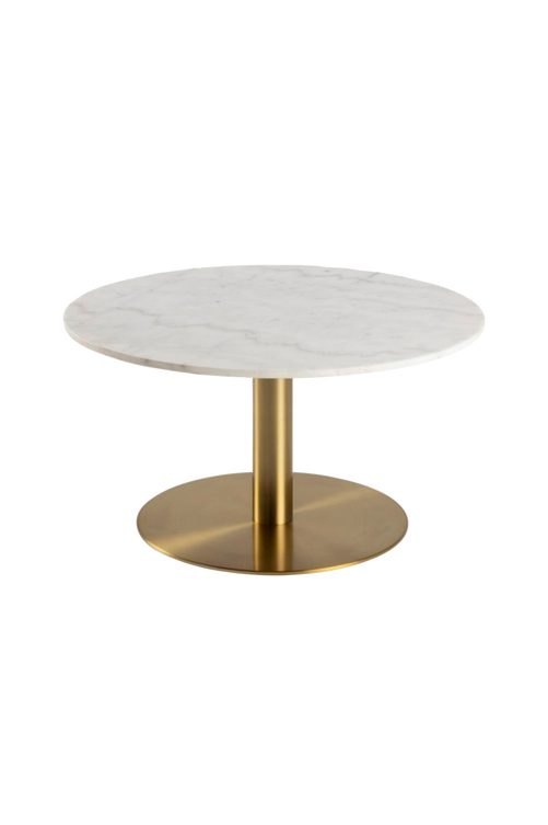 Detta soffbord, med polerad, vit bordsskiva av Guangxi-marmor, ger gott om plats för brickor, tidningar och kaffe. Soffbordet passar med alla moderna inredningsstilar och har en rund metallfot av borstad mässing. Bordet är packat i platta paket för enkel transport.