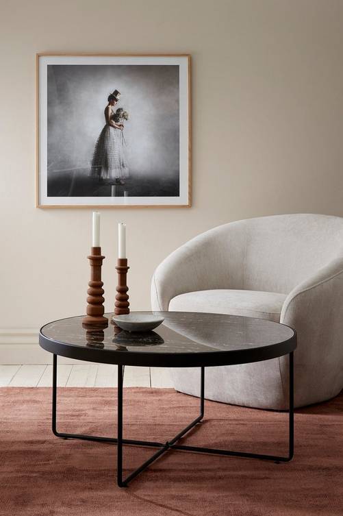 Runt soffbord med underrede och ben i metall. Skiva av härdat glas med marmortryck i botten. Höjd 39 cm, Ø 80 cm. Enklare montering.