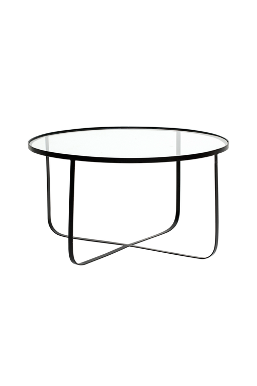 Soffbord med glasskiva och underrede i svartfärgad metall. Ø 80 cm.