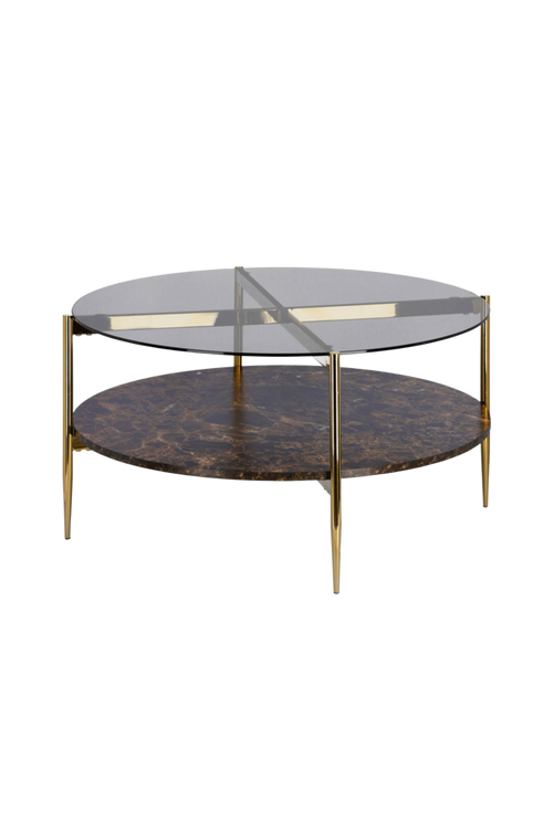 Vackert runt soffbord med glasskiva och marmor imitation.