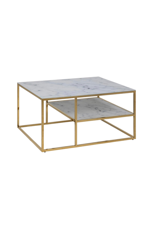 Detta glamourösa soffbord är både modernt och kraftfullt. Stomme av guldfärgat krom och vit, marmorliknande bordsskiva. Använd nedre bordsskivan för böcker och tidningar, samtidigt som hemmet får en lyxig känsla. De noggrant utvalda materialen är lättskötta – rengör produkten enkelt med glasrengöringsmedel och torka av med en mikrofiberduk.