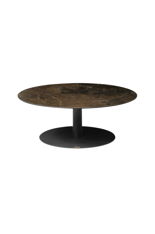 Snyggt och Stadigt soffbord. Topp i keramik som har en fin marmorlook. Underrede i lackerad metall. Bredd 100 cm, djup 100 cm och höjd 38 cm. Omonterad.