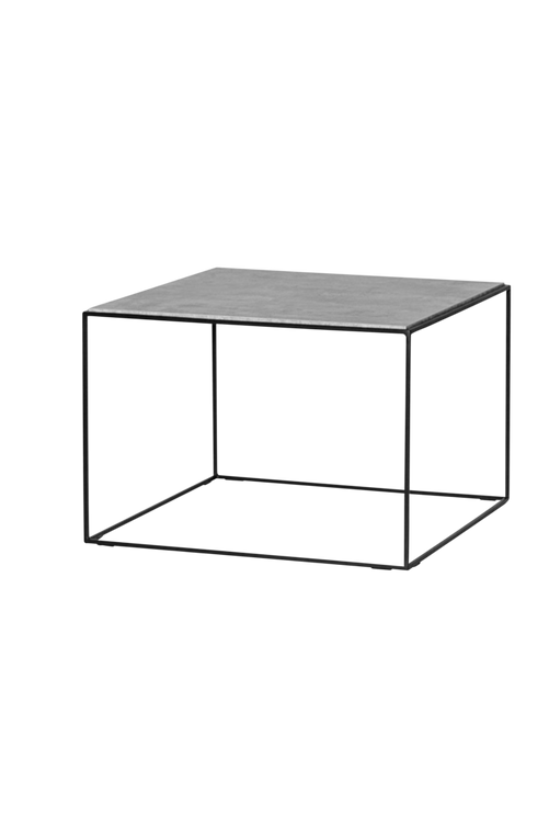Soffbord i svart metall med skiva i betonglaminat. Längd 70 cm. Bredd 70 cm. Höjd 48 cm. Vikt 8 kg.