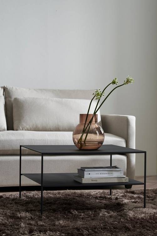 Soffbord av pulverlackad metall med sandig finish och lätt, fin struktur. Ett hyllplan. Höjd mellan hyllplanet och toppskivan 20 cm. Frihöjd under möbel 23 cm. Levereras monterat.