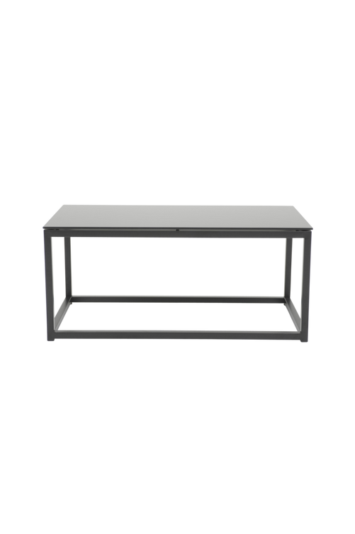 Soffbord i färgat glas och underrede i lackerad metall. Kan paras ihop till ett satsbord med Soffbord i större storlek. Bredd 94 cm, djup 47 cm och höjd 42 cm. Monterad.