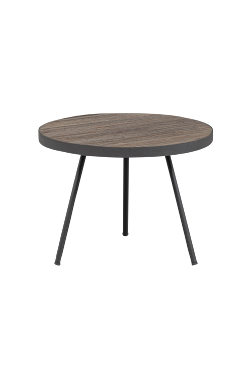 Stilrent sidobord med robust trä Bordsskiva gjord av återvunnen teak Varje produkt är unik! H 40 cm x Ø 54 cm En kraftig och robust bordsskiva på en smal, mattsvart benstomme. Du hittar denna snygga möbel i den exklusiva kollektionen Maxime från det nederländska inredningsmärket WOOOD. Träet i kollektionen Maxime är återvunnen teak med en grov känsla och varm färg. Det återvunna träets karakteristiska utseende ger varje produkt unika egenskaper. Material Teak är ett tropiskt lövträd och en mycket hållbar träsort. Teak har en unik mörkbrun/röd färg som ger ett mycket lyxigt utseende. Teak kännetecknas av en tät, rak ådring och är därför mycket lämplig för bearbetning. Användning utomhus kan dock orsaka missfärgning eller sprickor i träet. Detta påverkar inte konstruktionen. Mått Höjd: 40 cm Diameter: 54 cm Bordsskivans höjd: 3 cm Bordsskivans tjocklek: 1,5 cm Benens höjd: 38,5 cm Benens tjocklek: Ø 2 cm Avstånd mellan benen: 39 cm Maximal belastning: 15 kg Vikt: 7 kg Skötsel För att behålla utemöbler av teak i optimalt skick bör de underhållas regelbundet med lämpliga produkter, rådfråga en färgspecialist för bästa råd. Rengör inte teak med för mycket vatten eftersom det gör att träfibrerna sticker ut och möblerna blir sträva. Leverans Produkten levereras i ett paket och är lätt att montera med hjälp av den bifogade monteringsanvisningen. Sätt möbeltassar av filt under benen för att skydda hårda golv.