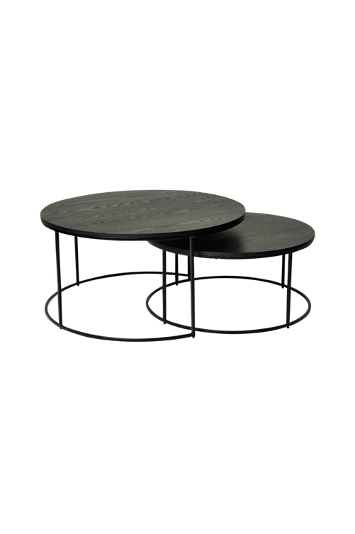 Soffbord i set om 2 st. Lackerad askfaner med underreden i lackerad metall. Bredd 90 (75) cm, djup 90 ( 75) cm och höjd 45,5 cm. Monterade