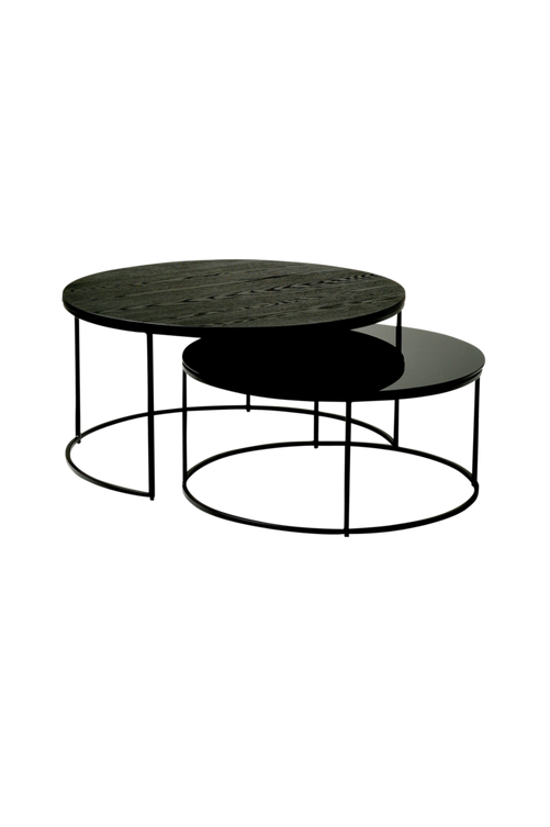 Soffbord i set om 2 st. Lackerad askfaner och sotat glas med underreden i lackerad metall. Bredd 90 (75) cm, djup 90 ( 75) cm och höjd 45,5 cm. Monterade