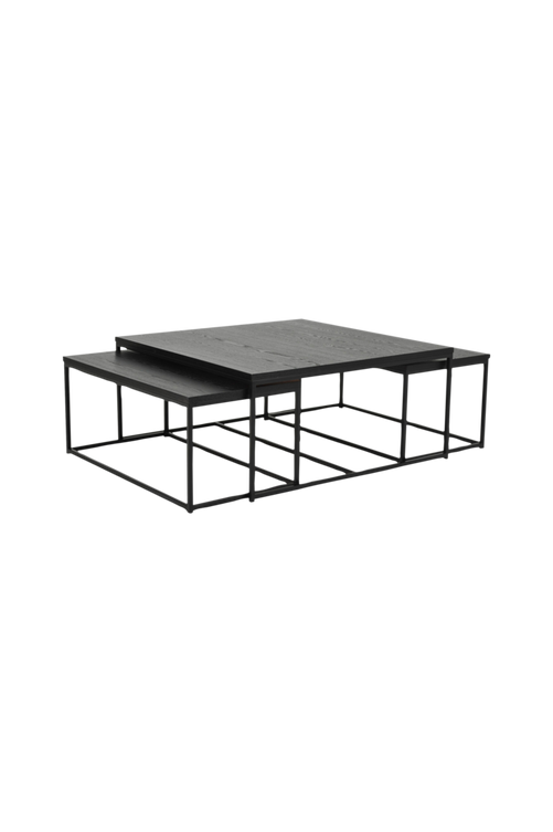 Soffbord set 2+1 i lackerad askfaner med underreden i lackerad metall. Stora bordet; 90×90, höjd 42 cm. Lilla bordet x 2; 44×85, höjd 37 cm.